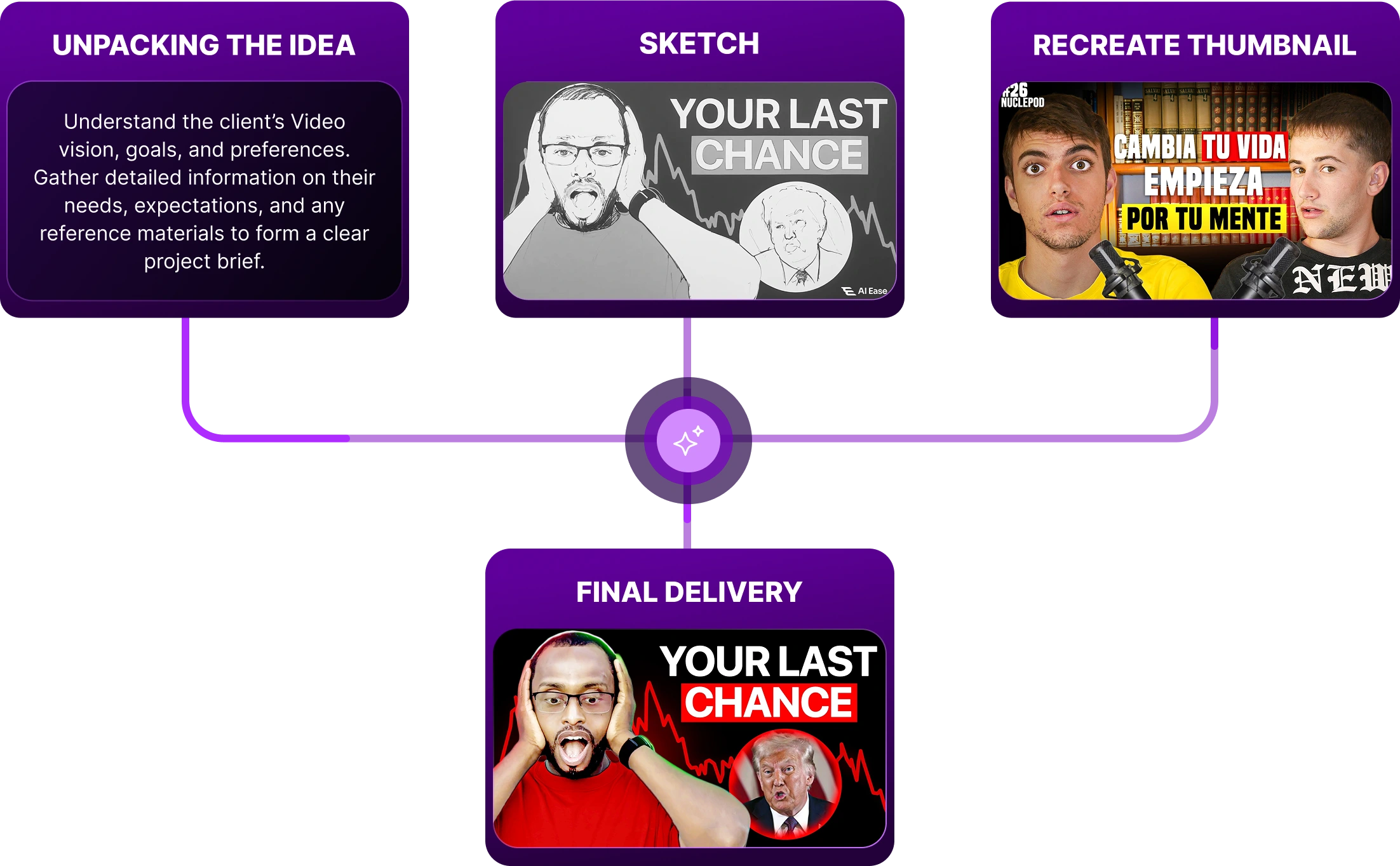 With Pro package you'll get full video packaging. We help you write the title, brainstorm sketches, and design the thumbnail for your video. This comes with an additional expert "Strategist" who will do all the prework for the designer.